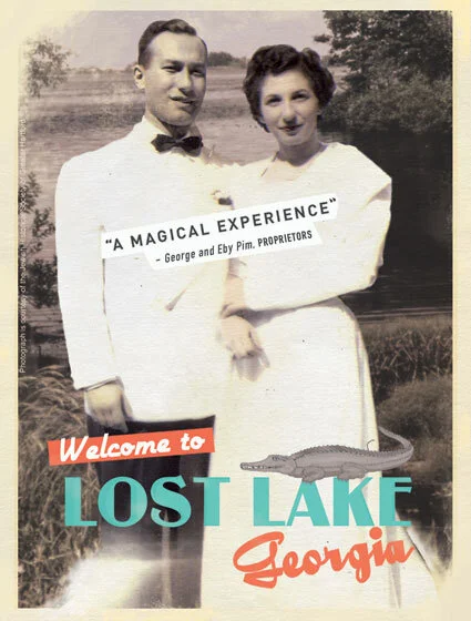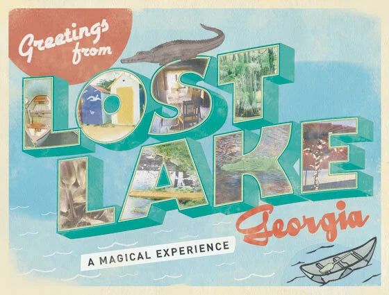 There were a total of seven postcards created for Lost Lake. Three postcards are in the book. Four extra postcards were created for promotion. All of them reference places and logos mentioned in the book. Designed by Helene Saucedo.